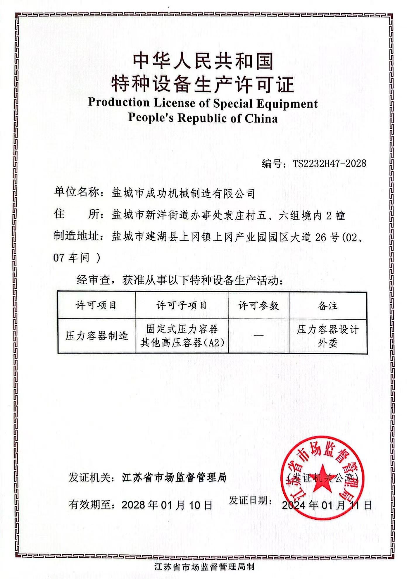 • 特種設備生產許可證